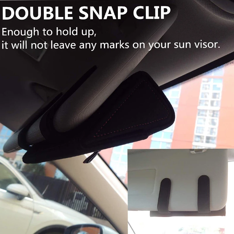 【INSTALL EASILY AND FIRMLY】 Just clip the sunglasses car holder over your sun visor, it has a double snap clip, strong enough to hold up and not move. The clip is flat and wide , it will not leave any marks on your sun visor.