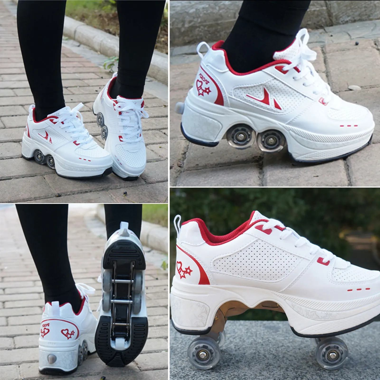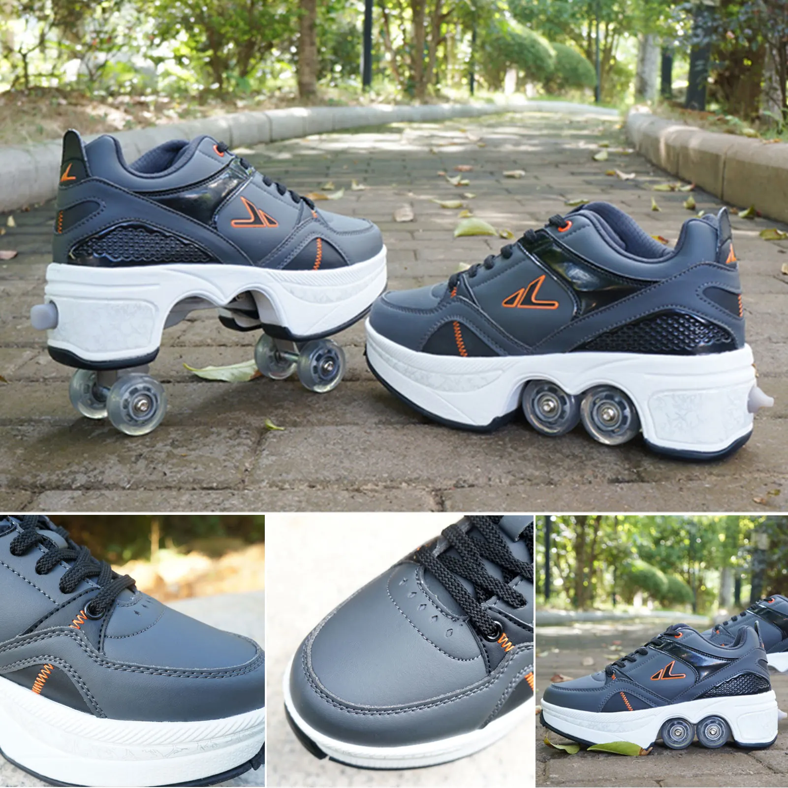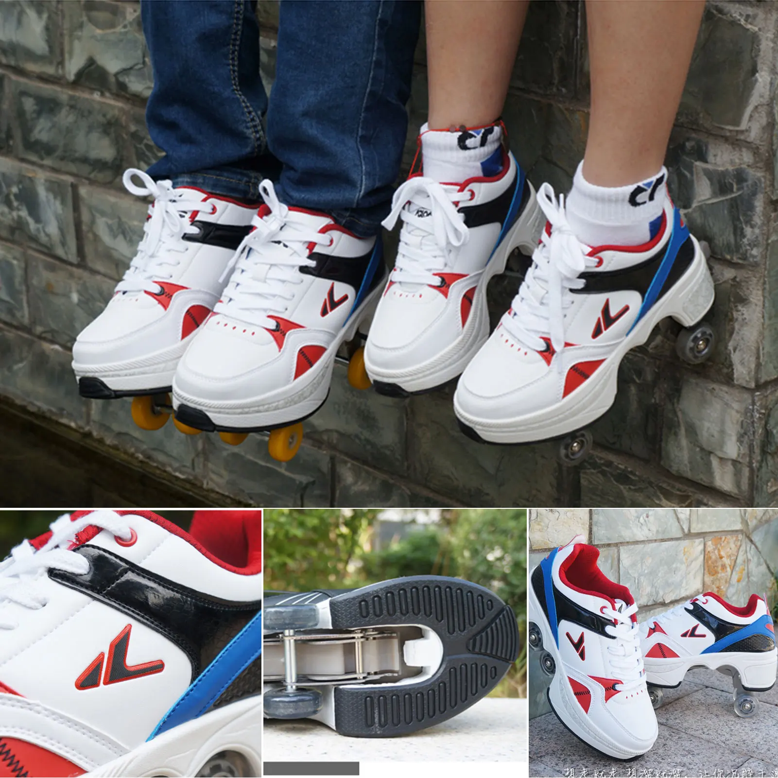 The shoes feature the unique invisible button to prevent accidental opening. And there is a button on the back of the shoe, press it and the wheel will open. Press and hold the button, push the wheel into the bottom plate and release it. 2. Comfortable to Wear: The shoes feature the upper foot pad structure to effectively protect the heel and make the shoes more comfortable to wear. 3. Wide Applications: The shoes are stylish and cool, and the deformation shoes are great for skating, party, disco, dance, birthday, Christmas. 4. Easy to Carry: Small and light, easy to carry, free to install on flat shoes, Eliminate the hassle of carrying and assembling. 5. Safe and Practical: The shoes have a good balance, so you can easily control the body's center of gravity, and the shoes are safe to use and lightweight. Specifications: Name: Deformation Skating Shoes Wheel material: ABS Wheel: PU wheel Sole material: EVA + rubber Size: 31-43 Weight-bearing: 300kg Applicable gender: male/female Packing List: 1 x Roller Shoes Common problem solving methods: 1.The switch is stuck and cannot be rotated: the tool can be inserted into the edge of the circular hole of the switch to pull out the switch. 2.The switch can't be opened: Check if the wheel is clamped too tightly. If the wheel is too tight, replace the left and right wheels 3. Wheels are not in place: clean the impurities in the bracket, add some lubricant to the friction parts and switches between the brackets. 4.The wheel does not close automatically and pops up: press the part connecting rod between the rear wheels to make the positioning pin completely snap into the slot. Notes: 1.When opening and stowing the wheel, please make sure that the direction of the arrow is upright, and then tap the switch with a certain force (instantaneous impact force). 2.The direction of the arrow is not the vertical lock. It is the state of the safety lock. The locked state cannot switch the wheel.