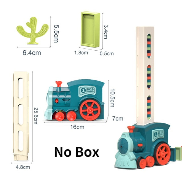 As the train moves forward, it will deposit the standing dominoes in a row.